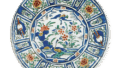 This is another typical Ko-Imari redware for export, and is estimated to have been fired between 1680 and 1690s. It is estimated to have been fired between 1680 and 1690s, i.e., from the Jokyo to Genroku period. The center of the prospect shows a peony flower arrangement, and on the left and right sides are vases with a petal and a chrysanthemum arrangement. The surrounding area is decorated with chrysanthemums and peonies, and a flying phoenix design is also shown. It is assumed that the unique design was created by order. This dish has a stepped shape at the waist, and the coloring of the underglaze blue is strong. The reverse side is unmarked.