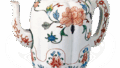 The works from the sake jar with dolls and peony design in overglaze enamels to the sake jar with peony design in overglaze enamels are unique examples of export porcelain produced by order from Europe from the Kanbun to Genroku periods. All of them were made as large bottles for pouring wine, so to speak, as substitutes for sake barrels, and the inlaid doll sake jar has a figure straddling the top of the barrel. Although made in a mold, the style is rather crude compared to Kakiemon’s Kanbun beauty dolls, and if the former is considered a good example, then this is a poor example. If the former is regarded as a good example, this is a poor example. However, the style is interesting, and there are few similar examples. The shape of this sake jar with seven gods of good fortune in overglaze enamels is clearly modeled after European metal vessels of this type, but the design on the body depicts seven gods of good fortune in the Japanese style. The design of Ebisu, Bishamon, and Benten riding on a sea bream is depicted in floating patterns, and weeping cherry blossoms and various other patterns are also depicted. The strings on the lid and other parts of the lid are indicative of metalware. The sake jar with peony design in overglaze enamels is a similar sake barrel with a four-sided body, and the four sides are decorated with peony, wisteria, camellia, chrysanthemum, and lotus designs. The color of underglaze blue and red is dark, and the overglaze painting is only red and gold. It was probably made between the Enpo and Genroku periods. All of them were imported from Europe in recent years.