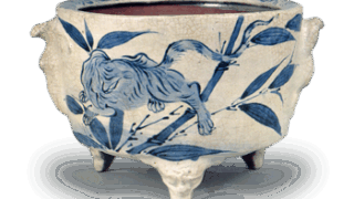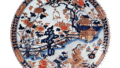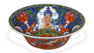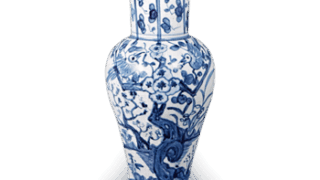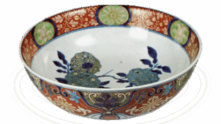 This is another example of porcelain for export, and its shape is clearly of European taste. The shape of the vessel is clearly of European taste, perhaps modeled after silverware. The chrysanthemum and arabesque-style lotus design on the four sides is over glazed with red, gold, blue, and yellow overglaze blue and yellow on the underglaze blue ground. It is thought to have been a special order item.