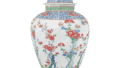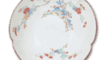 A large circular dish with a wide mouth and guard rim. It is a representative example of the Kakiemon style of large dishes with milky white hand painting, and the porcelain skin is almost pure white. The circular window in the center of the prospect shows a design of twin phoenixes, around which are divided into eight sections, and the fourth section is filled with a peony arabesque design, and the fourth section on a white background shows pine, bamboo, plum, and peony designs. The peony arabesque design is shown in white on a red ground, giving the overall color tone a glossy appearance, and the red color is reflected in the white milky-white hand-ground, creating a floral red color unique to the Kakiemon style. The pine tree, bamboo, plum tree, and peony motifs are all in the typical Kakiemon style, using taiko-stone as the base, and the design and overglaze enamels are all near completion. The molding is rather thick, with five small marks in the low, wide base, and a peony branch design in overglaze enamels on the outer three sides. The pine tree, bamboo, and plum tree patterns are quite formalized, suggesting that it was made between the Enpo and Genroku periods.