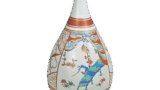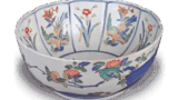 This is a representative example of the milky white hand Kakiemon style from the period of its completion. The pot has a sturdy body and a richly decorated lid with a decorative knob at the center of the lid shell. The exterior of the lid and body are decorated with a wave pattern on the base, which appears to have been molded, but is so spacious and free in its movement that it seems to have been carved freehand. The base of the bowl is thin and has a strong impression, and the deeply carved areas are covered with a thick transparent glaze that has a slight bluish tinge. The overglaze painting is decorated with chrysanthemums, leaves, and plovers scattered over the waves, which shows the care taken to effectively bring out the beauty of the white porcelain. The red, blue, and light green of the overglaze painting are all vividly colored due to the high quality of the base. In the center of the body, a flying phoenix and a pearl are depicted in color in the style of a group pattern, and the back of the lid is also painted in color with an orizabu pattern. There is one small mark in the center of the slightly elevated stand. In addition, there is a small letter “U” written in pale blue overglaze painting on the top of the base, which is probably a mark of the recipient of the order.