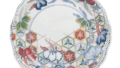 This is a flat platter with a ten-petaled flower-ringed mouth, and the mouth rim is raised low. The center of the prospect is clearly drawn with a double circle in dark underglaze blue, and the shallow sides are divided into ten directions. The bright flower-red color characteristic of the Kakiemon style is truly graceful, and when combined with the gold, it completes a different color scheme from that of Iro-nabeshima. The pattern within each section is based on the Kakiemon style flower and plant design, but is cohesive as a sectioned pattern, and there is some influence of European patterns. The outer surface is covered with a cherry river pattern, and the running water is painted in underglaze blue and the flowers in red and yellow. The base is a white porcelain of the highest quality with a slight bluish tinge. There are six marks on the base.