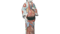 This is the most glamorous of the standing dolls in the so-called “Kanbun Bijin” style. She wears a chignon with a large chignon topknot, and her facial expression is elegant for a doll of this type. She wears an elegant kosode with a mesh pattern, and a uchikake (a type of dress with a kimono over it) with a rough design of peach blossoms. The topknot and short sleeve sleeves are typical of the Kanbun style, but the date of production is not that old, probably from the Enpo to Genroku periods. The white base is of high quality, so the overglaze colors of red, yellow, blue, green, etc., are beautifully rendered. In the Edo period, dolls of this type were generally called Imari Kakiemon dolls.