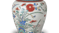 The mouth and shoulders are decorated with a continuous design in underglaze blue, and the body is decorated with a chrysanthemum design centered on a taiko-shi stone with branches and tips stretched out. The lotus petal design in underglaze blue around the neck in Figure 52 and the saw-tooth pattern in Figure 53 are done in a rather rough brush style, similar to Imari Sometsuke generally seen in Japan. However, the color tone of the overglaze enamel is different from that of the Imari style, and both red, blue, and green are bright and gorgeous.