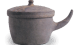 This bowl-shaped body, which has lost its waist tension and has a low pedestal, was made near the middle of the 7th century. The base is in a degenerate form with rectangular watermarks on three sides. The black surface of the bowl is covered with a dark green natural glaze, which is a magnificent finish.