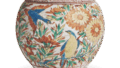 The spout is partially damaged and has been repaired. The bottom is in guttation form and has rounded legs on all four sides. The body of this sake bottle has a peony and plum bowl design in overglaze enamels, the ground is filled with red lines and the handle is painted in red. The four corners of the bottom have legs, and the bottom is decorated with a wood grain design in black lines, with green paint applied on top. It is estimated to have been made around the Kanbun period (1644-1644), but there are few examples of such rare vessels. This choshi with a willow heron design in overglaze enamels is almost the same shape as the choshi with a peony design in overglaze enamels, but it has a willow design on two sides of the body, one of which is decorated with two herons. The main colors used in the painting are blue and green, with red used only for some of the flowers and plants.