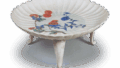 This is a tripod-shaped incense burner with lion-shaped knob. The tripod and ears are covered with a fine arabesque pattern in underglaze blue, and a floral pattern in red. It is an elegant incense burner made of dyed brocade, and is probably dated between the Enpo and Genroku periods.