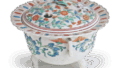 This is a rather deep bowl with a broad sword-shaped rim and a six-sided floral border. The rim has a six-sided floral circle with a flying phoenix design in the center and clouds and wildflowers in bunches around it in fine brushwork. The base is a milky-white with a slightly rough finish. The outer three sides are decorated with a design of orizabushi branches. Large bowls of this size are extremely rare. It was probably made between the Kanbun and Enpo periods.