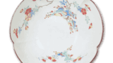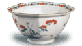 This gorgeous bowl is divided in eight directions, with a design of peach-peach branches on four sides and floral arabesques on a red ground on the other four sides. There are three marks on the base.