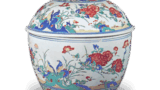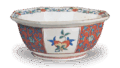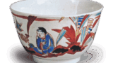 These pieces are also of the same shape and quality, although they may be of different sizes. The bowl with rose and flowers design in overglaze enamels and the bowl with autumn grasses design in overglaze enamels have almost the same design as the Hampton Court octagonal sake pot, with wisteria hakama on one side and bellflower design on the other, and a peony branch design on the prospective side. The lower limit of this piece can therefore be dated to the seventh year of the Genroku era (Genroku 7). The bowl with a plum and bamboo design in overglaze enamels shows a plum tree with a taiko-ishi stone in the center on two sides, a bamboo design on one side, and a peach design on the prospective side. The bowl with an Asuka design in overglaze enamels has three sparrows on one side of the body, a chrysanthemum design centered on a taiko-ishi stone on the other side, and five paulownia patterns scattered on the front. There is one mark on the base of the bowl. The bowl is of the same shape as the bowl with a design of peaches in overglaze enamels, and the rim design is the same as that of the bowl with a design of roses and flowers in overglaze enamels and the bowl with a design of peaches in overglaze enamels. The outside of the bowl has a Chinese figure and banana design on one side, and a plum tree design on the other side, with a plum tree design on the prospective side. There is a single mark on the base of the bowl.