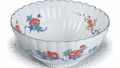 This is a bowl of almost the same form as the bowl with design of autumn grasses in overglaze enamels, but with brocade handles. It also has the same brocade handles as the bowl with peony design in overglaze enamels. The outside has a flying phoenix and floral motif on one side and a peony motif on the other, and the prospective owner has a butterfly with a Western floral design on two sides. Both the underglaze blue and overglaze blue are beautifully fired, and there is an inscription on the base “Made in the year of the Daming “Seika”” and a mark remains.