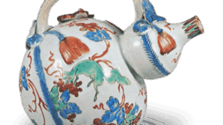 These are circular plates with milky white hand color painting. They were probably made around the Genroku period (1688-1704), but they may have been made in a slightly later period. However, they are not dated to the 1710s, i.e., the early Kyoho period. This plate with peony and tiger design in overglaze enamels depicts a bamboo tiger, peonies, and chicks, and although the design is somewhat lacking in panache, it is an unusual dish.
