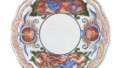 This dish does not have a Genroku inscription, but it is clearly one of the same type based on its style. The sword has a slightly deep flange with a stepped guard rim and a low raised mouth rim. The center of the prospect shows a dragon design with clouds, and the guard rim shows chrysanthemum arabesques on three sides and a design of blue ocean waves in between. The outer surface is covered with an arabesque pattern in underglaze blue, and the colors are truly brilliant. There are three marks on the base.