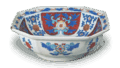 Height 7.0 cm, mouth diameter 19.9 x 19.7 cm, base diameter 11.2 cm This pot is in the kaki-nabe style, with a design similar to that of Nabeshima, and is overglazed with red, blue, and gold. There are three marks on the base.