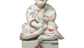 Compared to the previous group of dolls, these are somewhat cruder in the base material and offer incense burners and flower vases in their hands. Since the base material is not of high quality, the coloring of the color painting is not as vivid. And also, the facial features and hair styles are different from those of the aforementioned group. Doll 1 wears a kosode with autumn leaves scattered in a gauze pattern and a chrysanthemum stream patterned uchikake, and holds an incense burner in her right hand. Shiki-e doll 2 wears a kosode with a polka-dot pattern and a grape arabesque Uchikake, and Shiki-e doll 3 also wears a kosode with a polka-dot pattern and a Chrysanthemum stream pattern Uchikake. Doll 3 also wears a kosode with a gauze polka-dot pattern and a chrysanthemum stream pattern uchikake. Both of these dolls still have the fabric pattern at the bottom. The work of Iroe Ningyo 4 was imported from England.