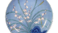 The inside is decorated with a frame of underglaze blue with a design of six nyoigashira and six cloud-shaped motifs connected alternately, an arabesque peony design in the nyoigashira, and a cloisonne design in the cloud-shaped motifs, while in the center, on a seat set on a rock decorated with clouds and pine trees, one person plays the zither and another person plays a figure in response, all in underglaze blue with line drawings and shaded strokes in dami-e brush. The work is a masterpiece of the Nabeshima technique of underglaze blue. The trunks of the trees on the right side and the pine tree at the top are painted in a unique coloring similar to the kaba (birch) color sometimes seen in Manryaku-aka-e and other works, which is also unusual.