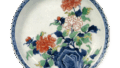 This dish is decorated with a design of blue ocean waves from slightly above the center to below, two peony flowers between the waves, and two large flowers and a storage mark above the waves. This design is also highly valued as a representative example of a seven-sun dish.