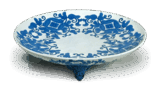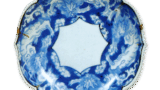 The lower half of the bowl is decorated with a design of water plants. The overglaze painting is vividly colored, but the leaves in underglaze blue are particularly beautiful and impressive. This dish is generally not highly regarded among seven-sun plates in overglaze enamels because of its mediocre design, but the composition and color scheme are by no means ordinary, and it is one of the better patterns among seven-sun plates. The outside is decorated on three sides with a floral arabesque centering on a six-petaled flower, which is often used on superior seven-sun dishes.