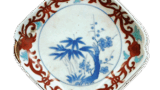 This is one of the typical designs of Nabeshima in overglaze enamels, as is the 7″ dish with a peony arabesque design. This design is probably a decorative version of the peony design, but it is generally called arabesque.
