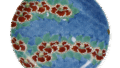 This is probably an early piece from the Minamikawara or Okawachi kilns. The style is similar to that of this 5″ plate, but the rise is slightly deeper. Three jars are arranged side by side, each with a gauze pattern, ice crack design, and floral arabesque design, and the ground is dyed lapis lazuli. The red color of the petals on the plate is deep and glossy. The outside of the dish is decorated with an ancient peony arabesque design with flowers on three sides in dark underglaze blue, and the base is a comb-shaped base.