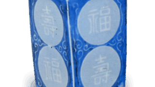 A representative celadon blue-and-white 5″ dish. The design features a large central motif of a peach blossom with the character “Kotobuki” (longevity) written in large letters on the fruit. Both the dark and light celadon and the celadon in the overglaze blue are beautifully finished, and a detailed peony arabesque design with flowers arranged on three sides is fully displayed on the entire outside surface.