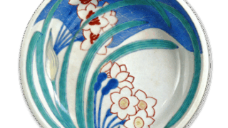 There are still many excellent examples of simple circular boar cups. This is the most outstanding example, with a camellia-juniper pattern on the body, and the straw design on the sides of the body gives it a graceful appearance. The red coloring on the edges of the petals, which leaves a blank space at the edges, is as gorgeous as on a large kagura camellia, and enhances the decorative effect of the design. Both the green and red colors are dark in tone, and the low base is covered with fine lines in underglaze blue.