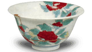This type of chintz-like pattern is often seen on old Nabeshima wares, but the overglaze painting on this boar cup is particularly vivid. The low base is covered with two thin lines in underglaze blue. The inside is white, and the molding is rather thick.