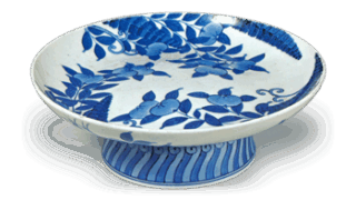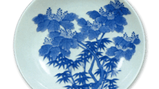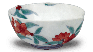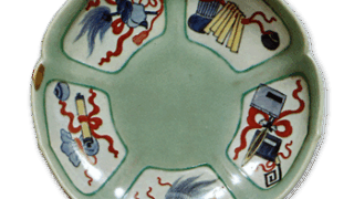 This is a five-petaled flower-shaped mukozuke with a shallow incision in the center of each petal. The frame of the petals is outlined in thick lines of underglaze blue on the outside in two layers, and the Karafana design is arranged within the frame. The colors of underglaze blue, red, and green harmonize beautifully, and the yellow dots on the stamens add an extra touch of luster. The yellow dots on the floral stamens add an extra touch of luster. The design of the entire vessel as if it were a flower is extremely rare, and this is one of the most outstanding examples of Nabeshima mukozuke in overglaze enamels.