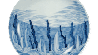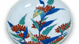 These works were conventionally called “Matsugaya,” but as already mentioned, they are assumed to belong to the Ko-Nabeshima group. All of the color paintings are made in both underglaze blue and overglaze blue, and are lacquered in the style of kotogitate. The molding is die-cut, but the pieces are thick and solid. The purpose of each of these vessels seems to have been the same, and they may have been made as booze cups. Some of them have thin tubes attached to the sides. Some of them are covered with a residue of overglaze painting, which is quite careless, yet they have a certain dignity.