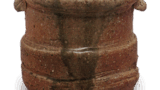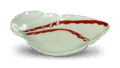 This is a tripod dish with legs on the three outer sides of a wide serpentine base, the rim of which has been worked into a leaf shape. The border is decorated with a design of morning glories in underglaze blue and covered with a celadon glaze. The glazed surface is oxidized and has a yellowish tinge. The celadon glaze is somewhat dull, but this is probably one of Minamikawawara’s celadon glazed wares.