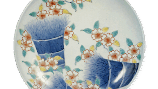 The plate with weeping cherry blossom design in overglaze enamels is a plate showing weeping cherry blossoms on a light lapis lazuli ground, but the green pigment is a little too faint and the coloring is poor. The back of the dish is decorated with an arabesque pattern of five-petaled flowers arranged in six directions, and the base is decorated with a series of two-tiered heart-shaped patterns unique to Ko-Nabeshima.