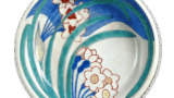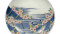 This piece depicts an autumn scene of autumn leaves, bush clovers, and thin foliage, with a two-tiered fan. The design is purely Japanese, which is the pride of Nabeshima, with blue ocean waves on the ground in white ink blotches. The reverse side shows a typical cloisonne pattern on three sides. The comb pattern on the high pedestal is rather long.