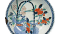 Disn with design of pomegranates along the fence. underglaze blue,overglaze enamels