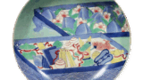 This is a representative example of a seven-sun underglaze blue plate. The extremely unique design depicts a weir seen from the front. This is the first time such a design has been seen on a plate. The design on the reverse side is a lotus-like pattern with branches on three sides, and it is an example of the style that shows the old status of the Okawachi domain’s kilns. The back is decorated with a three-sided design of oriented branches in the manner of magnolias.