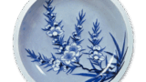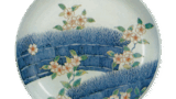 This shallow-rise, old Nabeshima-style vessel is decorated with a graceful design of twelve gourds arranged around it. The back is decorated with peony flower patterns on five sides in arabesque. The bowl has a comb-shaped raised stand.