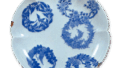 This dish has an unusual design with a rounded pattern of Chinese flowers on the radiation, and the shape of the dish is also unusual in that the mouth is warped and the rim stands low. The back of the dish is decorated on three sides with a lotus-like design and is set on a comb-shaped base.