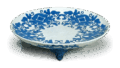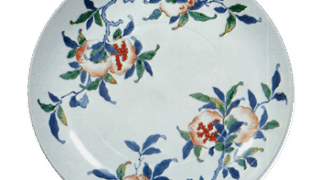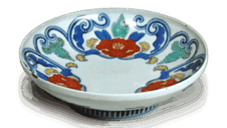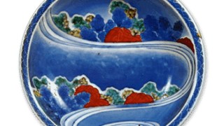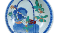This is a so-called “dai-bachi,” a seven-sun dish with a high pedestal, but dai-bachi are rare in Nabeshima. The prospective view shows a lucky design of tachibana and yokyogusa, and the base is decorated with a Warabi-te style pattern. The back of the bowl is decorated on three sides with a rose design.