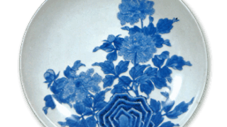 Dish with chrysanthemum and water stream design,underglaze blue, overglaze enamels