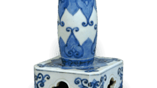 This piece depicts the chrysanthemum stream design often used in Arita overglaze enamels, but it is somewhat different from other chrysanthemum stream designs. Both the underglaze blue and overglaze blue are dark in color. The sword guard is surrounded by a design of blue ocean waves, and the back has a single cloisonne knot pattern on three sides. The mount is comb-shaped.