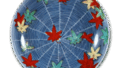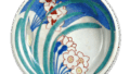 The design of white circles on a background of dragon eyes, with pine, bamboo, and plum patterns inside each circle, looks as if it were a kosode-split. The shape of the vessel is rather shallow, in the style of old Nabeshima, and is thought to have been made by the Okawachi Kiln. The back is covered with peony arabesques, and the base is decorated with short comb patterns.