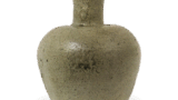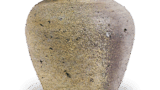 This small jar with a short neck is one of the most common forms of Sue ware used throughout the entire period. There are two types of jars: covered and uncovered. This is a covered jar that has lost its lid, but unusually has three annular ears on the shoulder. The vessel has a thick wall, and the lower half of the body has been carved, while the upper half has been adjusted by kakime, a process known as “kaki-me.