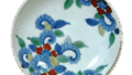 This is a beautifully designed work that fills a small three-sided dish with a large design of a large pine tree and blue ocean waves. The color of the underglaze blue is dark, and the celadon color is slightly yellowish. The reverse side is decorated on three sides with a design of peonies and branches, and has a comb-shaped raised stand. Five pieces have been handed down.