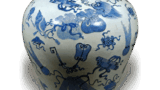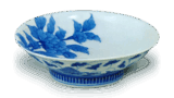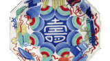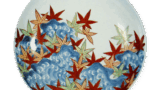 This flat dish with a fan-shaped surface has a circular hole on the right, although it is not clear what it was used for. The left side has an arabesque design of cherry blossoms, and the right side has a cloisonne design with cherry blossoms scattered over it. The bottom also has a fan-shaped base covered with lotus petals.