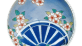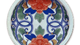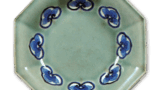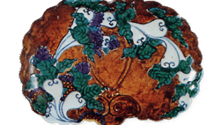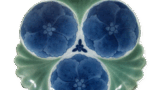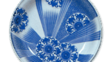 This oddly shaped dish has a design of a pine tree with three covers, and the front is dyed in lapis lazuli. The reverse side is decorated with floral arabesques on two sides, and the base is covered with a comb pattern.
