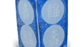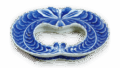 This is a representative celadon triptych. The low base has leaf-shaped legs on the outer three sides, and the inside of the base, which has a serpentine guttation, has eight needle marks on the outside and seven on the inside. The color is a beautiful powder blue, characteristic of the Nabeshima domain kilns.