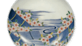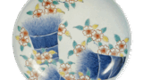 This stylish cylindrical mukozuke has a straw hand design on the outer surface, and the convex part is covered with a white ground, while the concave part is covered with a celadon glaze. The low stand with tatami mats has been carved out.