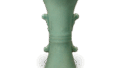 The shape of this vase is modeled after a Kinuta celadon vase with phoenix ears, but the rounded base and phoenix ears are somewhat atypical.