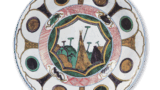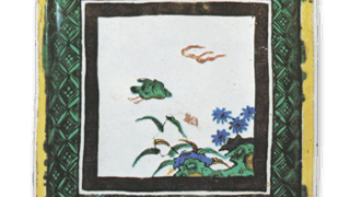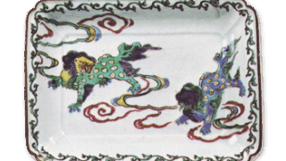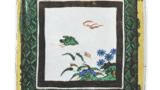 The reverse design is similar to that of the “Shu-en” dish (Fig. 53) in the collection of the MOA Museum of Art. The design on the reverse side is also similar to that of the “Shu-en” dish, with Asuka on two sides and Mount Yomogi and flower patterns on two sides. The inscription “Fuku” is inscribed on the base and painted in dark blue.
