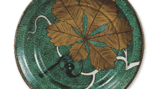 The composition is almost the same as that of the large dish with a chrysanthemum and water stream design in a tortoiseshell shell, but a quail and floral motifs are gently displayed in a white slip in the center, and the surrounding tortoiseshell shell is framed by a five-layered band of colored patterns, with a crane circle design in the center. Although slightly smaller than the large dish with chrysanthemum and water stream design, this is also a very large piece. The peony arabesque design on the reverse side is not as wild as the previous one, but it is done in underglaze blue with purple on the petals, yellow on the stamens, and green on the leaves of the arabesque. The inscription on the base is inscribed with the Chinese character “fuku” (blessing).