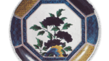 Nonagonal dish with pine and hawk design, enamelled ware